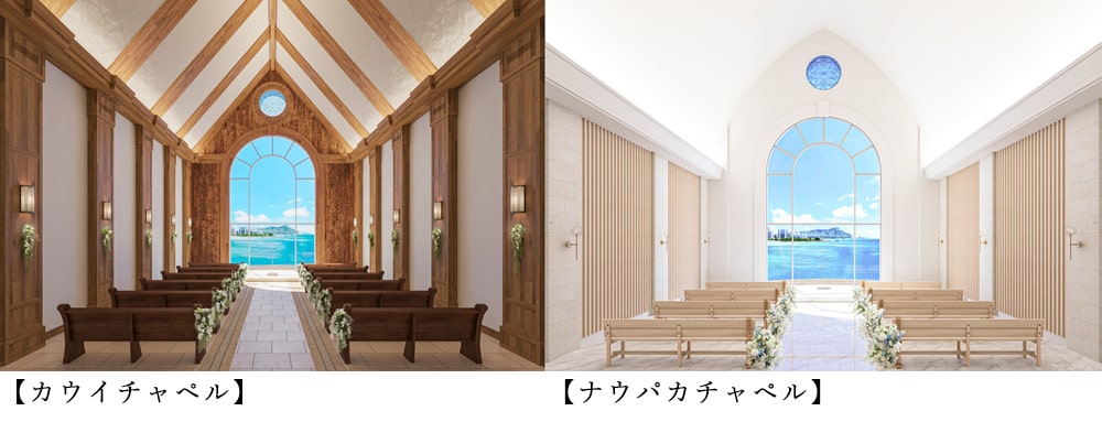 神々が宿るハワイの神聖な木、コアウッドの温もりで満たされた“カウイチャペル”。山に咲く“マウンテンナウパカ”と海に咲く“ビーチナウパカ”の刻印が印象的な木目のチャペルです。チャペルフラワーは、ハワイの大自然に咲いた花々をイメージしたナチュラルな装いです。
